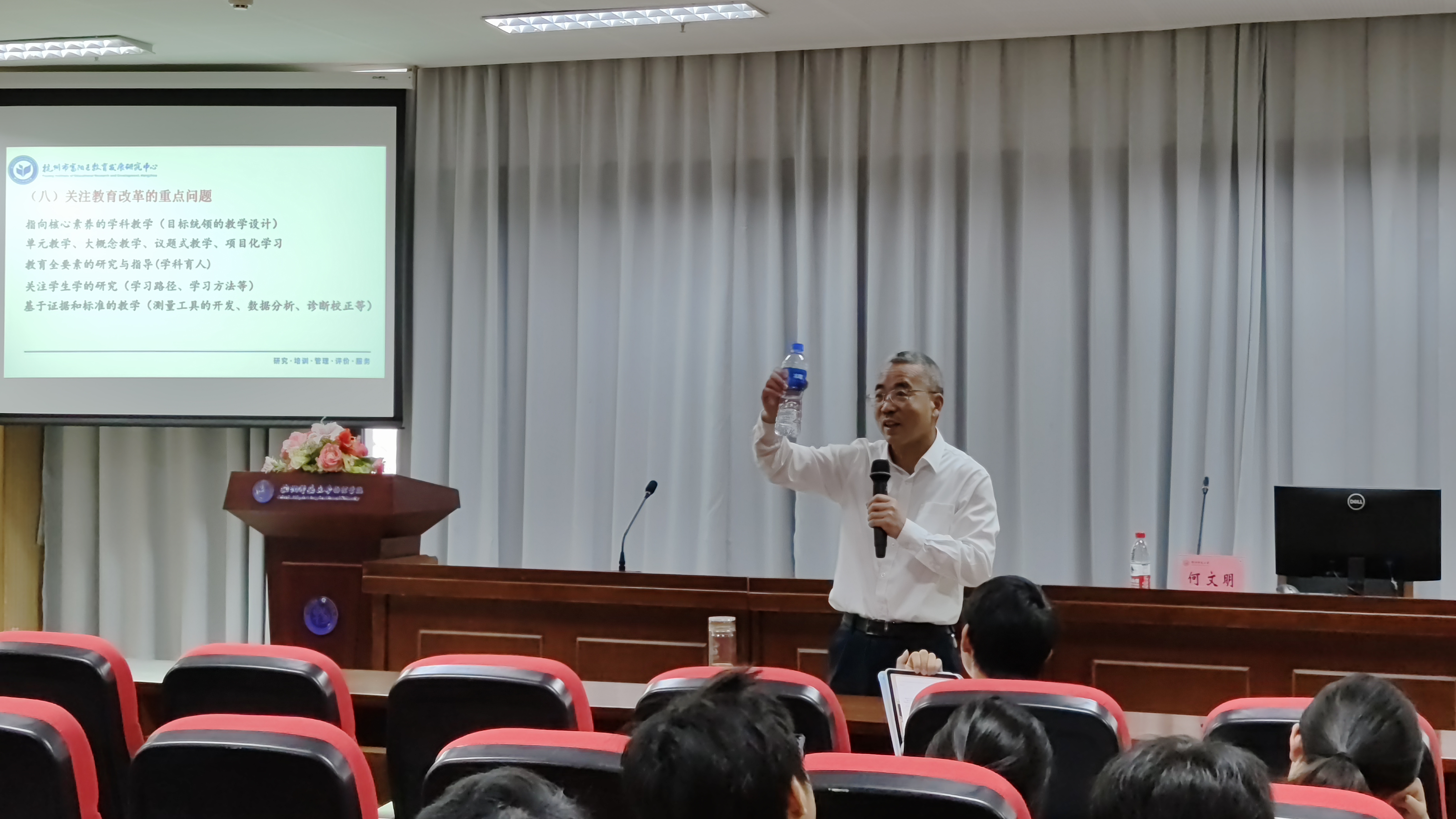 何老师开篇点明了新时代对教师提出的新要求与新挑战,就教师历史方位、教育办学方向、推进育人方式三点进行了详细论述。他认为,实验是物理、科学学科特有的,具有不可替代的重要性。在深化课堂教学改革上要积极探索基于情境、问题导向的互动式、启发式、探究式、体验式学习模式。在加强科学类学科教学的基础上进一步强化学科的育人功能,凝练提出学科核心素养,改变过去单纯看知识、技能的掌握程度,引导教学更加关注育人目的,把立德树人任务落到实处。