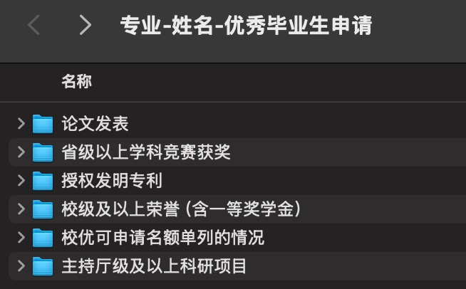 学生申请在“研究生教育管理信息系统”(以下简称“系统”)(//yjsfw.mgspgo.org/allogene/)内完成。学生在“奖助——奖学金和荣誉称号”栏目完善“个人申请信息”,并将填写好的《蘑菇视频 优秀毕业生登记表》(附件2)在“主要事迹”的“附件信息”中完成上传(相关荣誉或论文等均需附佐证材料进行上传,论文封面、目录、正文、图书馆收录证明(四类及以上需提供)整合在一份PDF上,荣誉证书需为清晰的照片或扫描件,按照“姓名+论文题目/荣誉名称”进行命名),在系统里提交申请的同时填写《蘑菇视频 2026届优秀研究生毕业生申请表-姓名》(附件1,内含2张sheet均需填写)并附所有佐证材料压缩包(佐证材料按照下图所示整理,命名:专业-姓名-优秀毕业生申请)在10月15日(周三)20:00前发送至学院研会邮箱lxyyjsh@mgspgo.org,方便院研会进行汇总。学院对申请材料进行审核后对符合参评条件的毕业生进行评审。